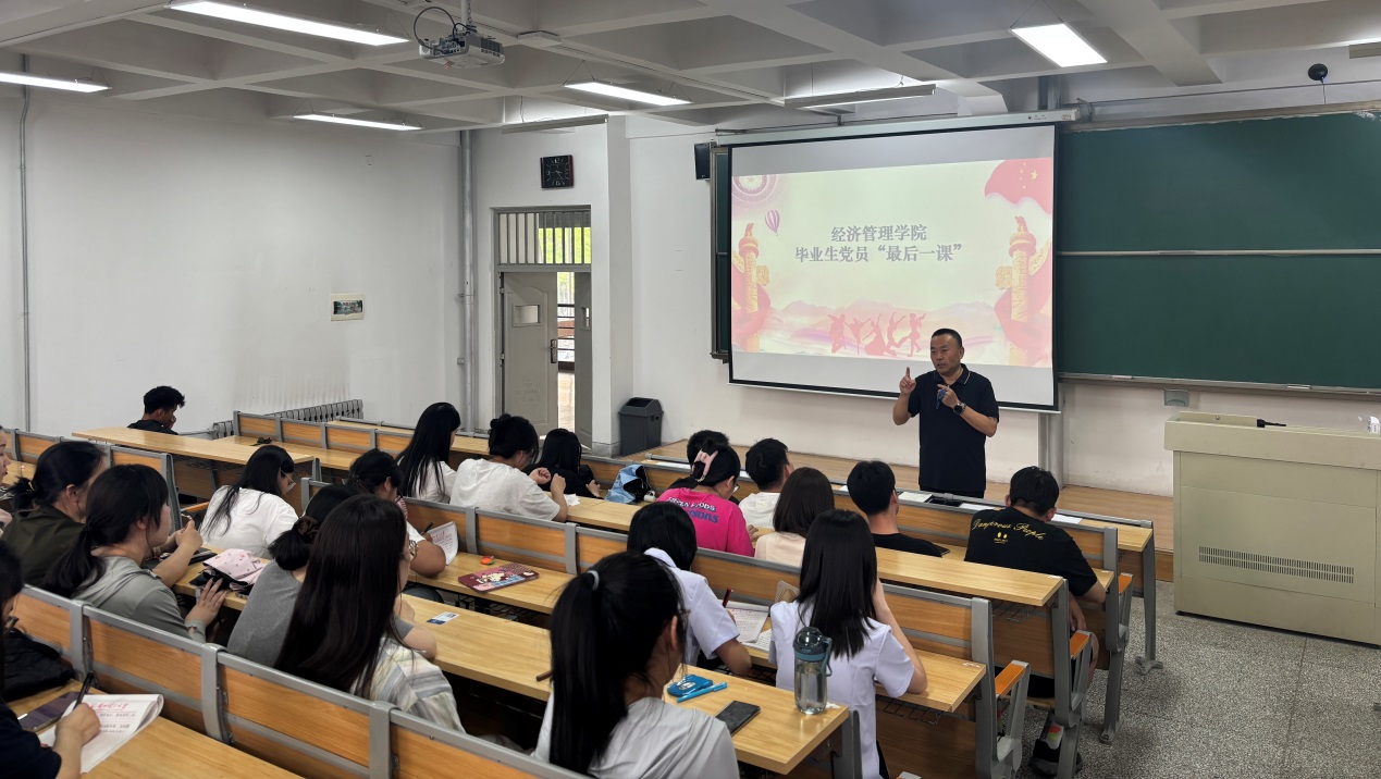 為深化畢業(yè)生黨員黨性教育,引導青年黨員在人生新起點上永葆政治本色,6月18日,經(jīng)濟管理學院舉辦2025屆畢業(yè)生黨員最后一次黨課活動。經(jīng)濟管理學院黨委書記張清輝為畢業(yè)生黨員講授畢業(yè)前的“最后一堂黨課”,全體2025屆畢業(yè)生黨員參加此次活動。