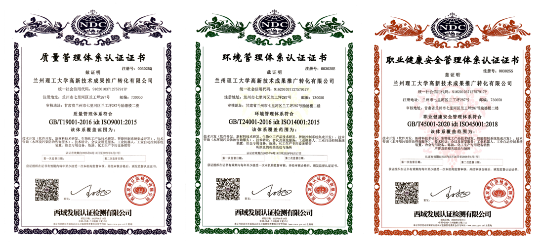 近日,蘭州理工大學(xué)高新技術(shù)成果推廣轉(zhuǎn)化有限公司順利取得“ISO三體系”(ISO9001質(zhì)量管理體系、ISO14001環(huán)境管理體系、ISO45001職業(yè)健康安全管理體系)認(rèn)證證書,這是公司在提升企業(yè)綜合實(shí)力過(guò)程中取得的新進(jìn)展,標(biāo)志著我校高新技術(shù)成果推廣轉(zhuǎn)化有限公司在精細(xì)化、制度化、規(guī)范化管理方面邁上了新臺(tái)階。