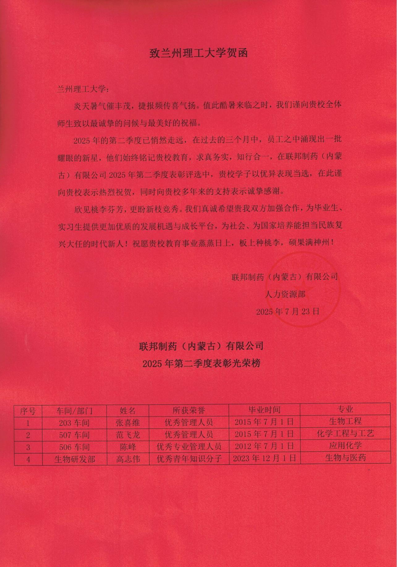 近日,聯邦制藥(內蒙古)有限公司向我校發來賀函,祝賀在該公司工作的我校4名畢業生在2025年第二季度表彰評選中榮獲多項榮譽,并對學校的人才培養質量給予高度評價。