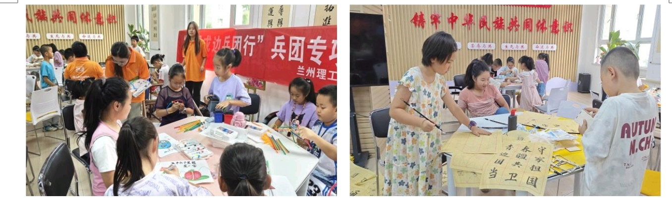 在石河子第42社區,志愿者們為兵團兒童打造了一場融合文化傳承與成長啟蒙的“七彩假期”實踐活動。兵團精神主題繪畫課堂上,孩子們用彩筆描繪出軍墾戰士墾荒的身影、豐收的棉田與整齊的營房,每一筆都浸透著對革命前輩的敬仰;“書法課堂”里,他們握著毛筆,在紅紙上一筆一畫寫下“衛國戍邊”“強國有我”,稚嫩的字跡中藏著對兵團精神的深刻感悟。