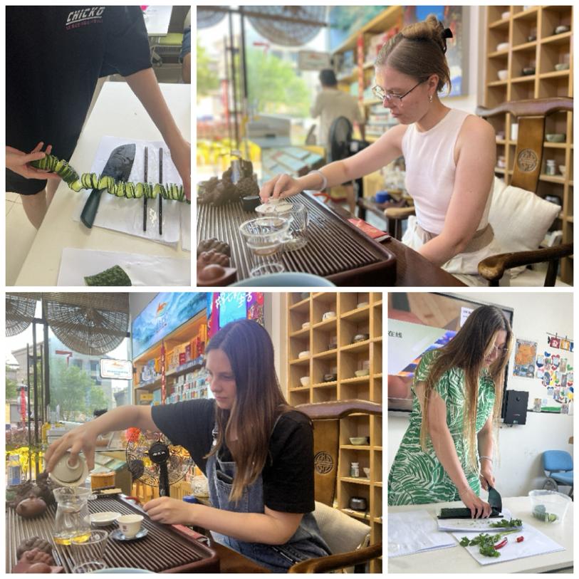 國際教育學院二樓教室的講臺旁,學員們圍站成圈,在盧璽如老師示范下切著黃瓜絲,體驗中國菜未必需要烈火烹油濃油赤醬,家常小菜讓營員們理解了“人間至味是清歡”。轉身走進巷尾茶店,霍亞玲老師帶營員們坐在泛著溫潤光澤的木質茶桌旁,看執壺注水,觀一芽一葉,學員們模仿著舉杯細啜,從舌尖的鮮爽到喉間的回甘。小菜清茗形成奇妙呼應——中國人的生活熱情,就藏在這看似平淡的清雅之間。