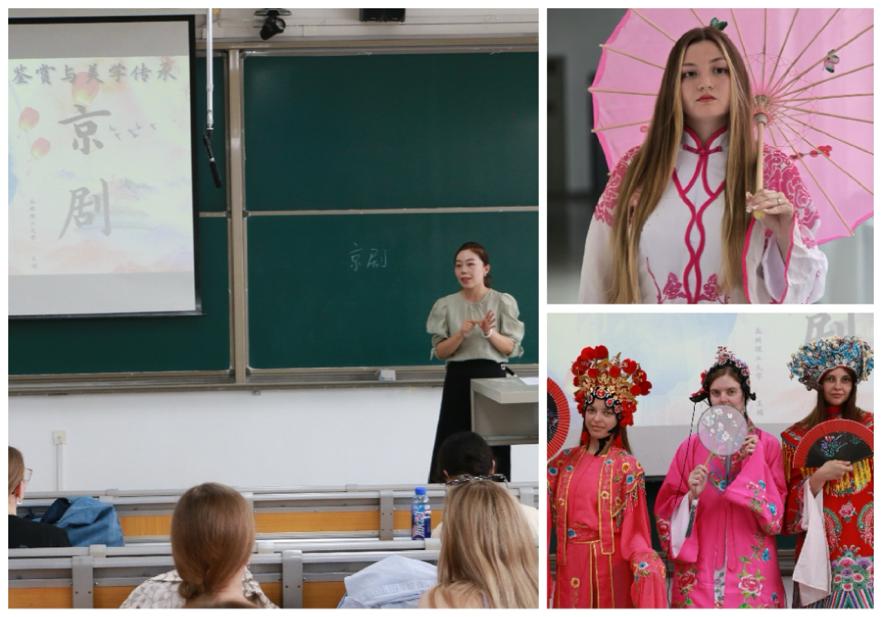 王娟老師沒有想到,俄羅斯和中亞學員對我們的國粹戲曲如此熱情,每一個學員都毫不掩飾對華服的喜愛和對王老師華美唱腔的傾佩。從生旦凈丑的角色分辨,到水袖輕揚、身段走位,學員們學得有模有樣。一句句念白、一段段唱詞,讓他們領略到戲曲的獨特韻味,沉浸式感受中國傳統藝術的寫意之美。