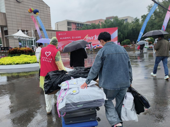 行李搬運,接過沉甸甸的“行囊”。沉重的行李是新生報到途中的一大難題,尤其在雨天更顯不便。為此,各服務點專門配備了板車、小推車,并組織了一支“骨干搬運隊”。志愿者們不辭辛勞,主動幫助新生將一件件行李從校門口搬運至各公寓樓棟樓下,傳遞了互助友愛的校園精神。