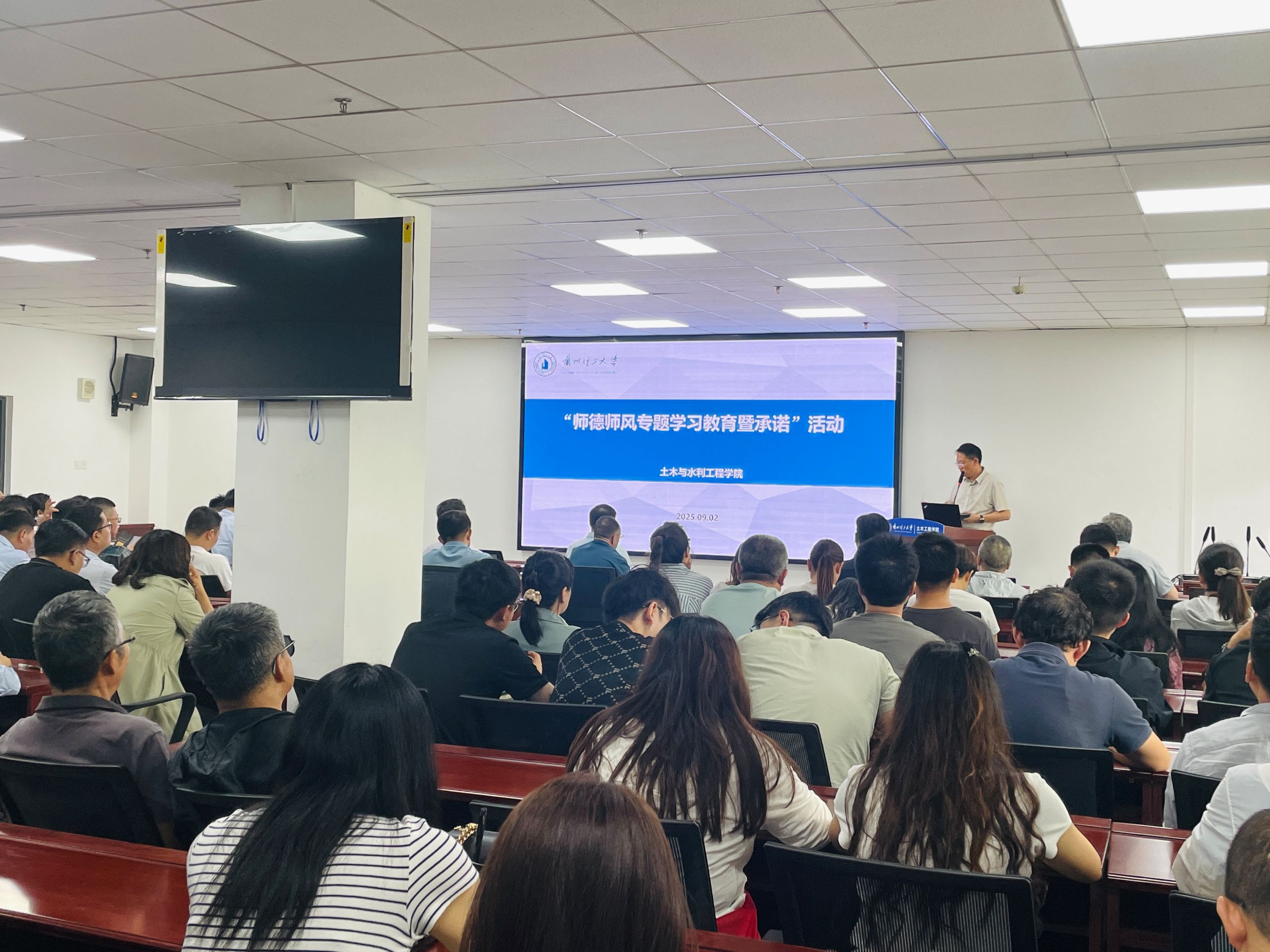 為深入學習貫徹習近平總書記關于教育的重要論述及教師隊伍建設的重要指示批示精神,大力弘揚教育家精神,引導全體教職員工以飽滿的工作狀態開啟新學期工作,9月2日,土木與水利工程學院舉行“師德師風專題學習教育暨承諾”活動暨教職工大會。會議由黨委書記趙煒主持。