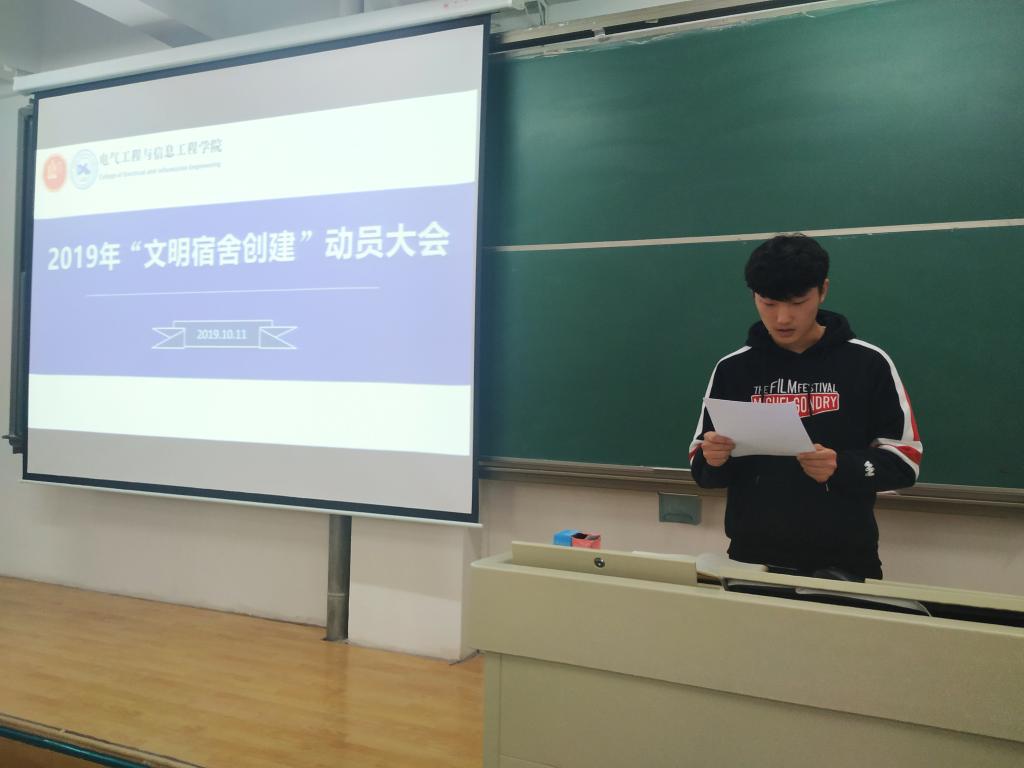 會議伊始,2018級輔導(dǎo)員常序老師宣讀了學(xué)院2019年“文明宿舍創(chuàng)建”提升工程實(shí)施方案;2017級任鵬麗老師宣讀學(xué)院關(guān)于評選“優(yōu)秀宿舍長”的通知;學(xué)生代表2017級趙石磊同學(xué)宣讀了電氣工程與信息工程學(xué)院“文明宿舍創(chuàng)建”倡議書,希望全體同學(xué)從小事做起,共同營造優(yōu)秀的宿舍環(huán)境,樹立“愛舍如家”的信念,自覺維護(hù)宿舍秩序,養(yǎng)成良好的生活習(xí)慣,積極響應(yīng)學(xué)院號召,為文明宿舍的創(chuàng)建貢獻(xiàn)出自己的一份力量。班振海老師對本次“文明宿舍創(chuàng)建”提升工程具體工作做了部署安排,并傳達(dá)了學(xué)院的相關(guān)要求。希望廣大學(xué)生干部、黨員和入黨積極分子投入更多的時間和精力,齊心協(xié)力,力爭通過文明宿舍創(chuàng)建活動使宿舍建設(shè)水平提升一個檔次,涌現(xiàn)出更多的優(yōu)秀團(tuán)體。各班級要認(rèn)真落實(shí)文宿舍創(chuàng)建的相關(guān)工作,積極動員全體宿舍宿舍開展文明宿舍創(chuàng)建活動,保證文明宿舍創(chuàng)建工作“落實(shí)、落細(xì)”。